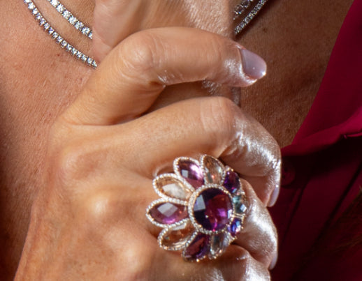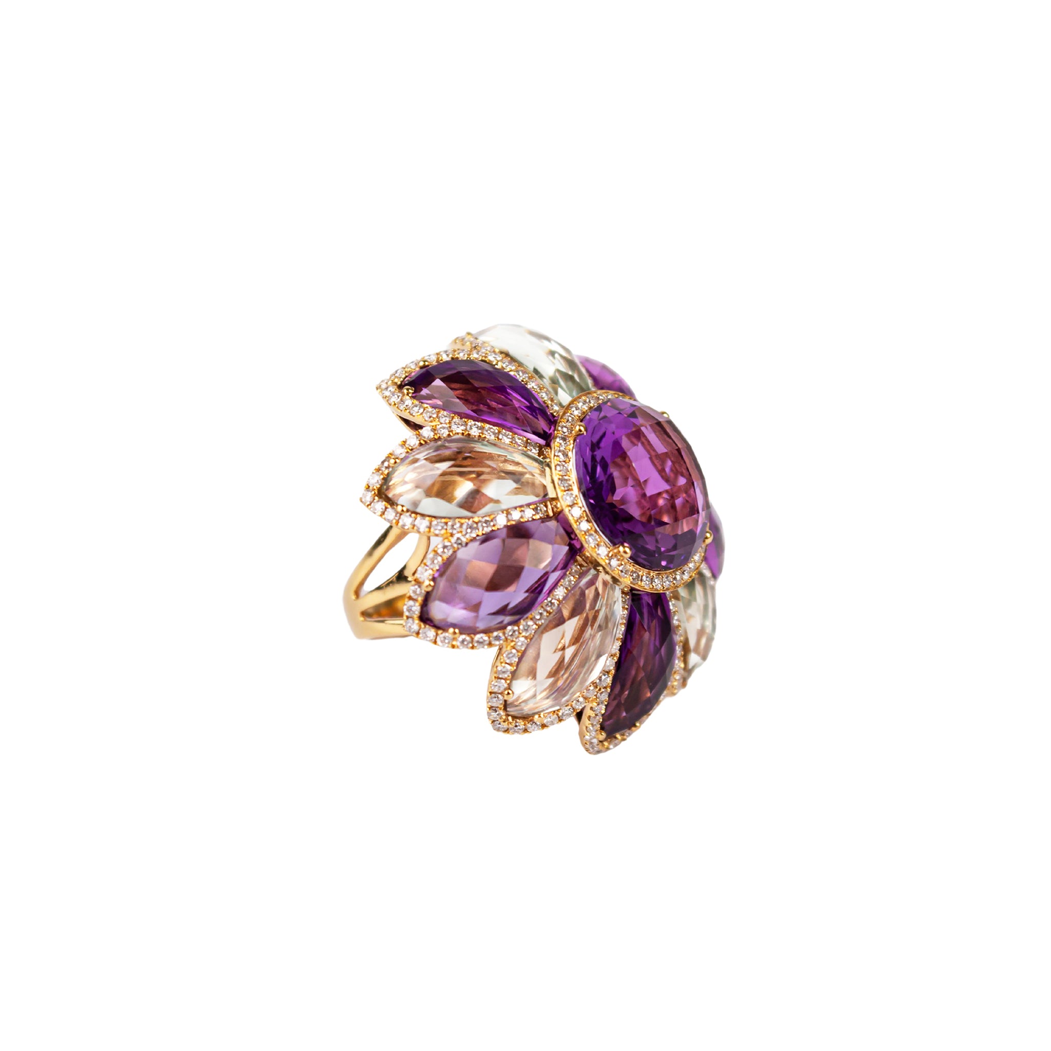 Anello in oro bianco e oro rosa 18KT, Brillanti, 1,03KT, color F, VS1, Ametista 28,92KT, Ametiste rosa e verdi.