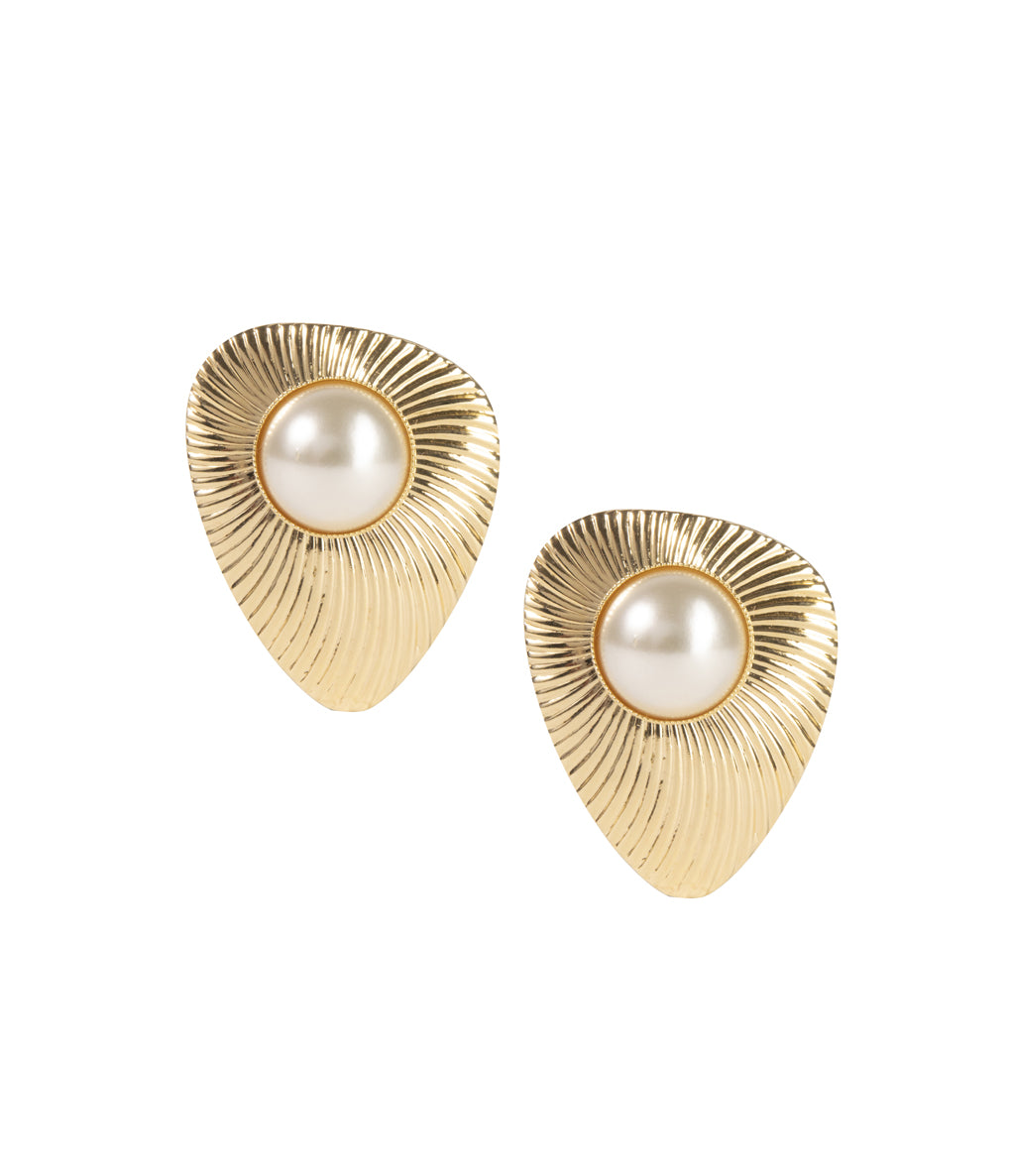Golden brass earrings, striped shield measuring 36x29mm, with a 13mm mabè pearl in the centre. Attachment with pin and butterfly.